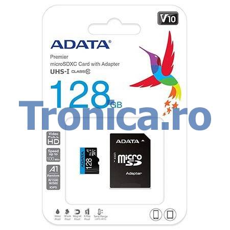 Card microSD cu adaptor SD, marca Adata, capacitate 128 GB, clasa 10